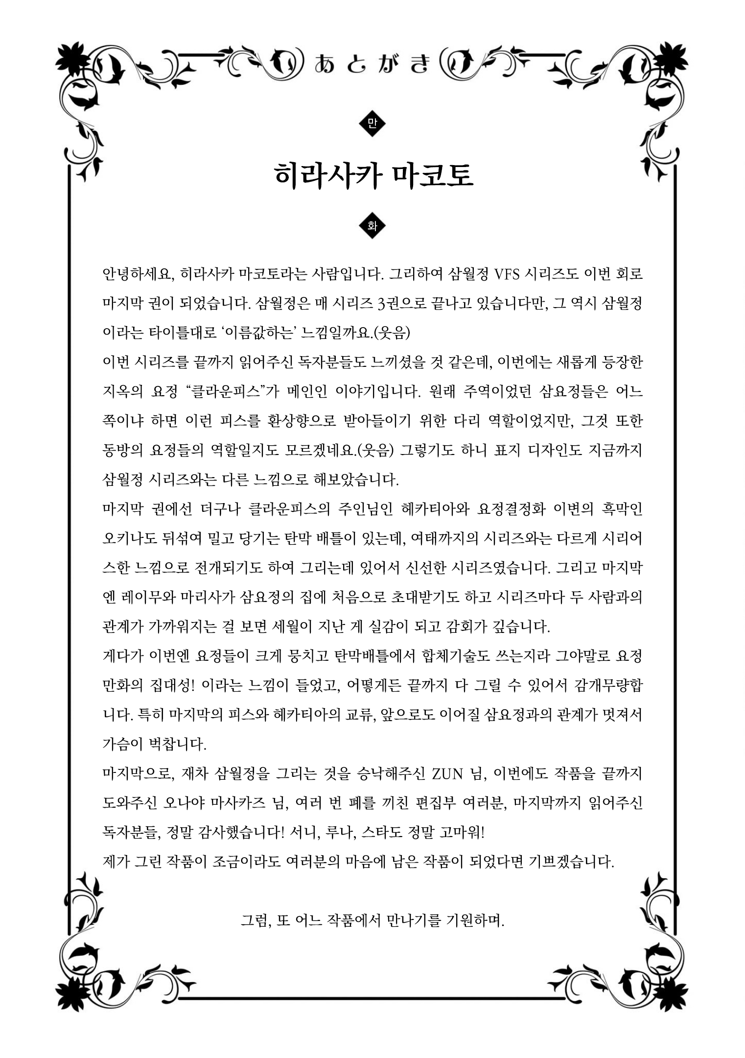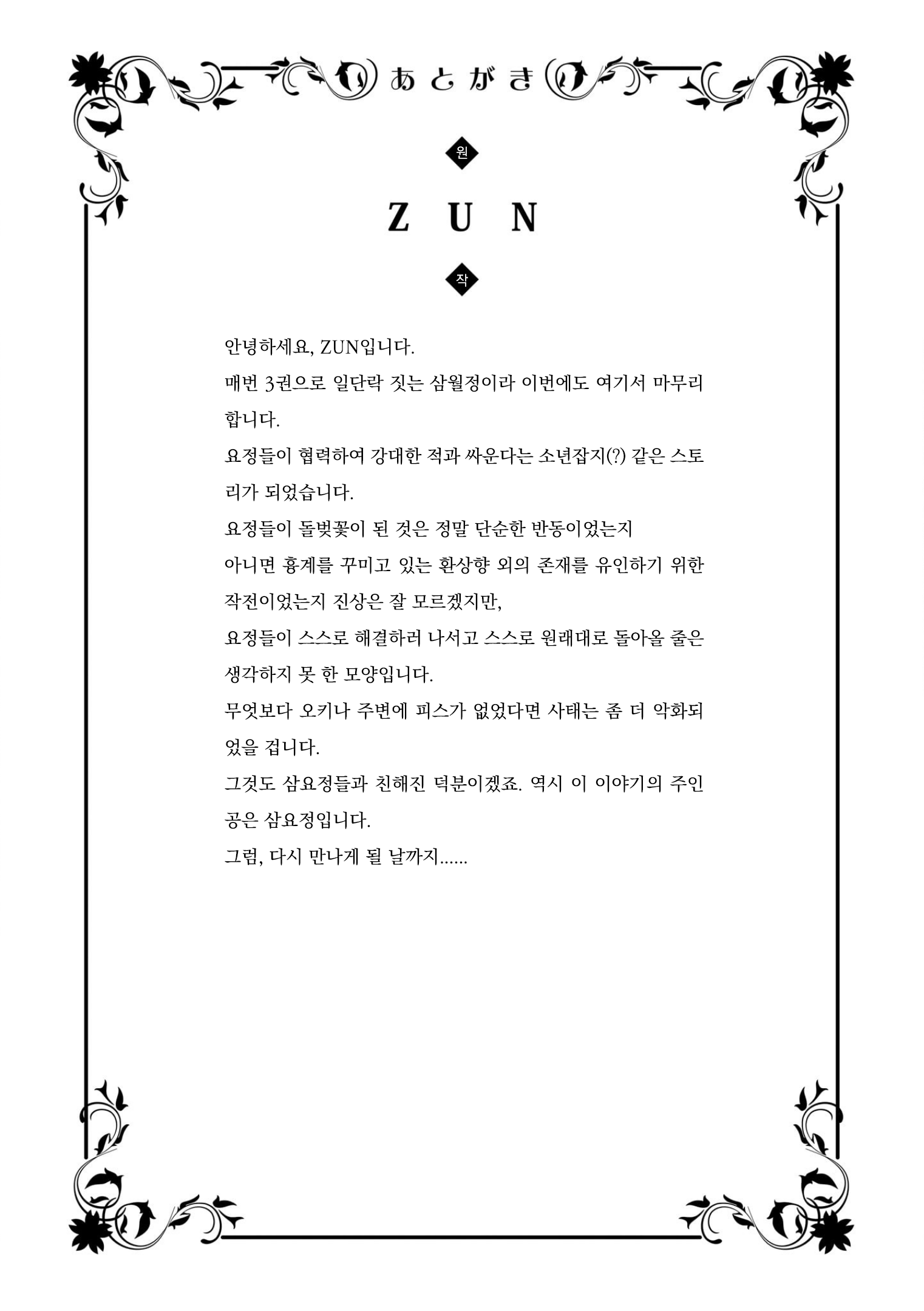 | 동방삼월정 1기 1권 부록 - ZUN 인터뷰, 후기, CD해설 등 (1) | 2020.03.05 |